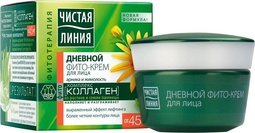 Уверены ли вы, что ваша кожа получает все необходимые питательные вещества? Ведь в зрелом возрасте именно питание и увлажнение кожи — главные помощники в борьбе за молодость и красоту. С учетом особых потребностей зрелой кожи эксперты Чистой линии разработали специальную линейку средств от 45 лет. Активные натуральные компоненты, входящие в состав средств, эффективно борются с морщинами, выравнивают цвет лица и наполняют кожу энергией и сиянием. В состав кремов линейки входят активные натуральные компоненты, созданные самой природой: арника, жимолость и комплекс фито-протеинов. Кремы Чистая Линия обогащены комплексом Фитоколлаген из ростков и семян пшеницы. Уже с первого применения проникая в кожу, комплекс Фитоколлаген наполняет и разглаживает ее. Уже через 16 дней восстанавливает контуры лица. Дневной фито-крем c арникой и жимолостью от 45 лет эффективно увлажняет и питает кожу, разглаживает морщины. Активные натуральные компоненты комплекса Фитоколлаген с ростками и семенами пшеницы, проникая в кожу, разглаживают ее, наполняют энергией и придают сияние. Результат: мгновенно: разглаживает мелкие морщинки и подтягивает кожу, за 16 дней: выраженный лифтинг-эффект, заметно меньше морщин, кожа гладкая и упругая. Бренд Чистая Линия бережно относится к окружающей среде: мы ‘заряжаем’ продукты природной пользой для вас, при этом предпринимая меры по сохранению нашей общей зеленой планеты для будущих поколений. Мы закупаем 100% возобновляемую электроэнергию, полученную с использованием энергии ветра, для производства продукции на наших фабриках в Екатеринбурге и Санкт-Петербурге, а также направляем 100% производственных отходов на утилизацию, отличную от передачи на полигон: на переработку или дальнейшее использование в других отраслях. Бренд Чистая Линия заботится о нашей природе.