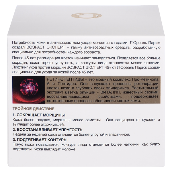 Дневной крем для лица «Возраст Эксперт 45+» от Лореаль Париж обладает тройным эффектом: сокращает морщины, восстанавливает упругость кожи и подтягивает контуры лица. В состав формулы входят ретинопептиды (Про-Ретинол А и пептиды), которые стимулируют процесс обновления кожи, воздействуя на глубинные слои эпидермиса, а также растительный экстракт цветка опунции - Виталин, известный своими восстанавливающими свойствами, который поддерживает естественные процессы обновления клеток кожи лица.