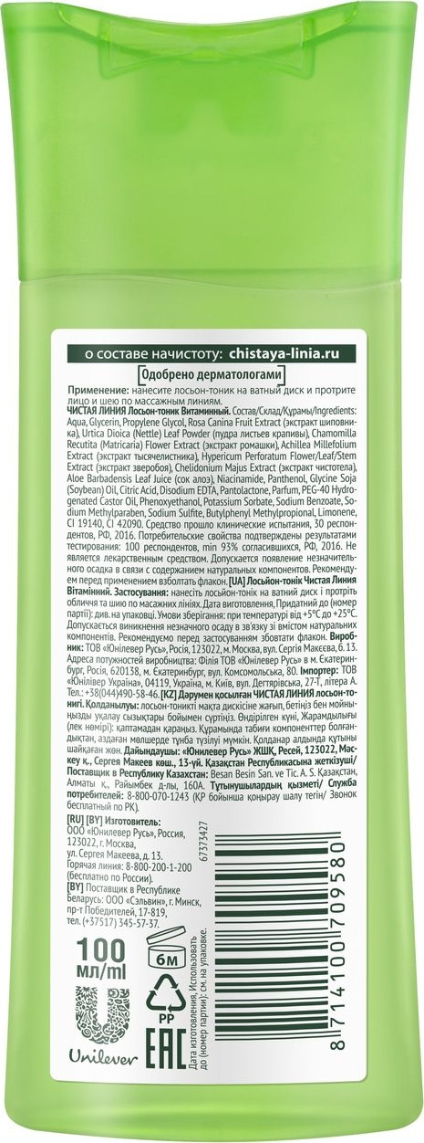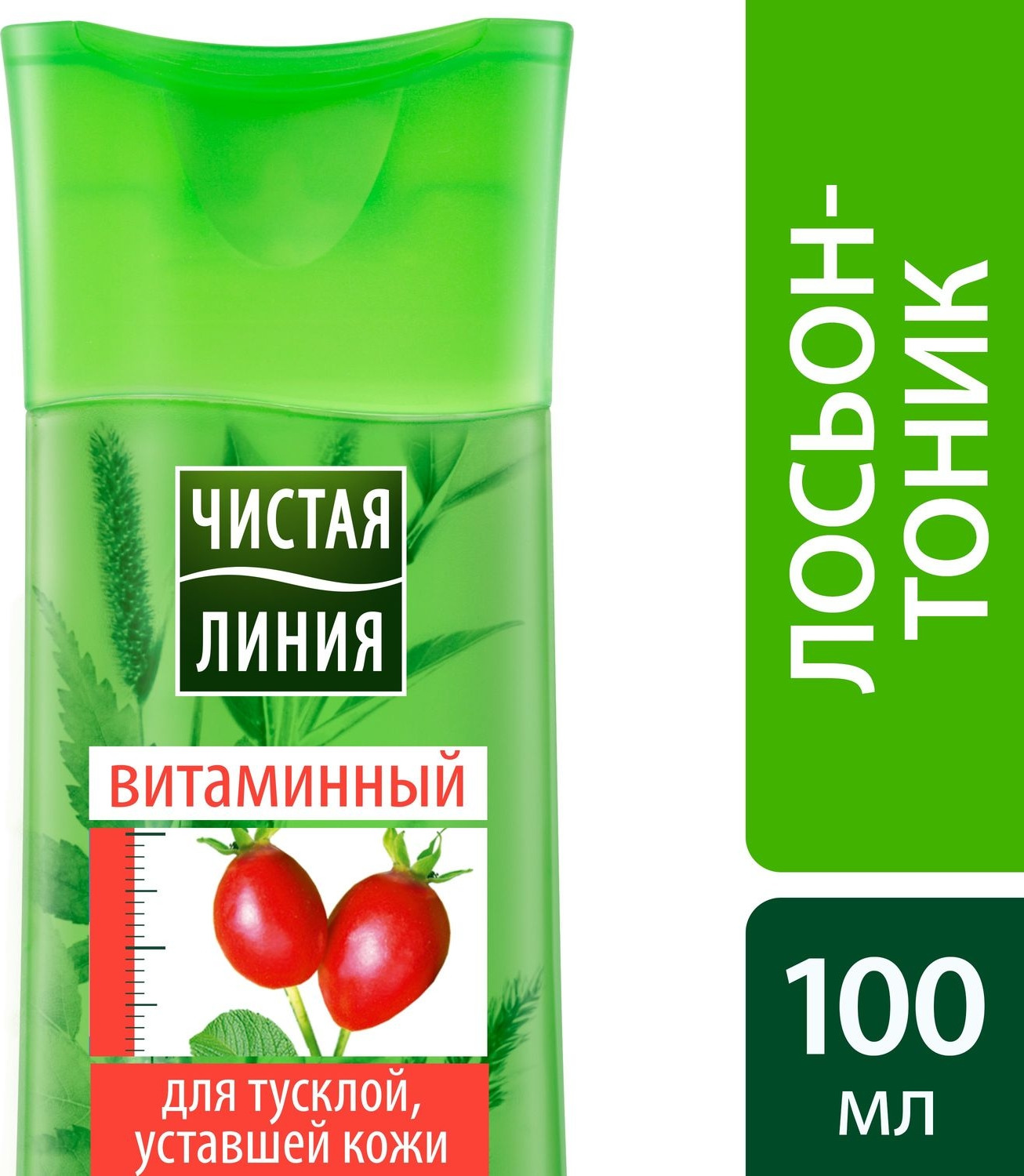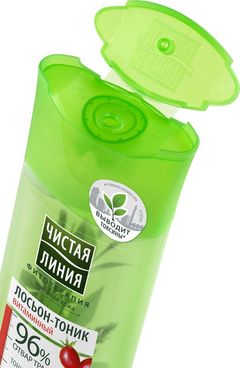 Лосьон-тоник Чистая линия Витаминный создан специально для тусклой и уставшей кожи. Отвар трав усилен экстрактом шиповника: для тонизирования кожи, свежего и здорового цвета лица. Идеален для использования утром. Результат: Улучшен цвет лица, а кожа сияет.